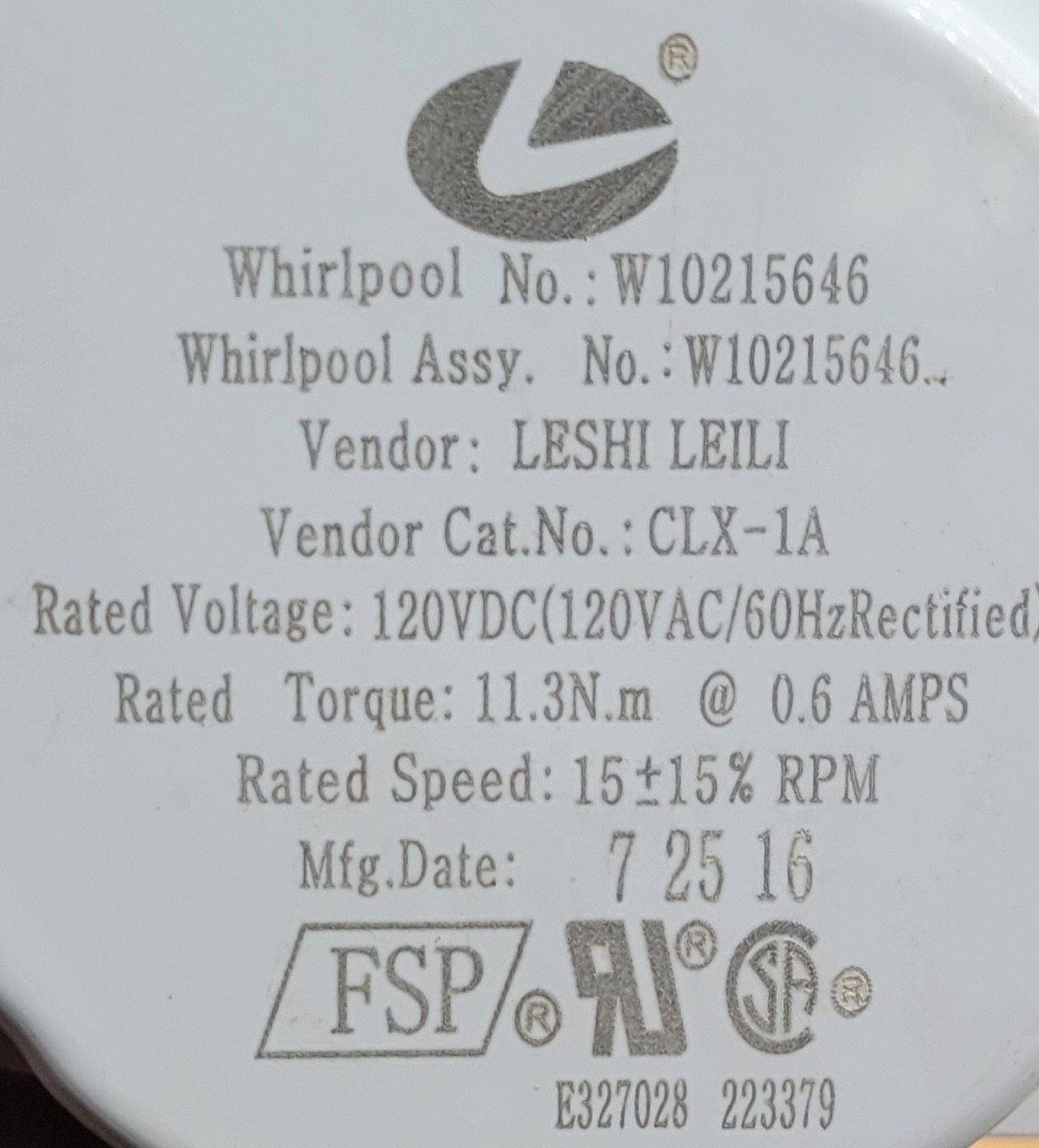 USED Genuine Refrigerator Whirlpool Auger Motor Part#W10215646